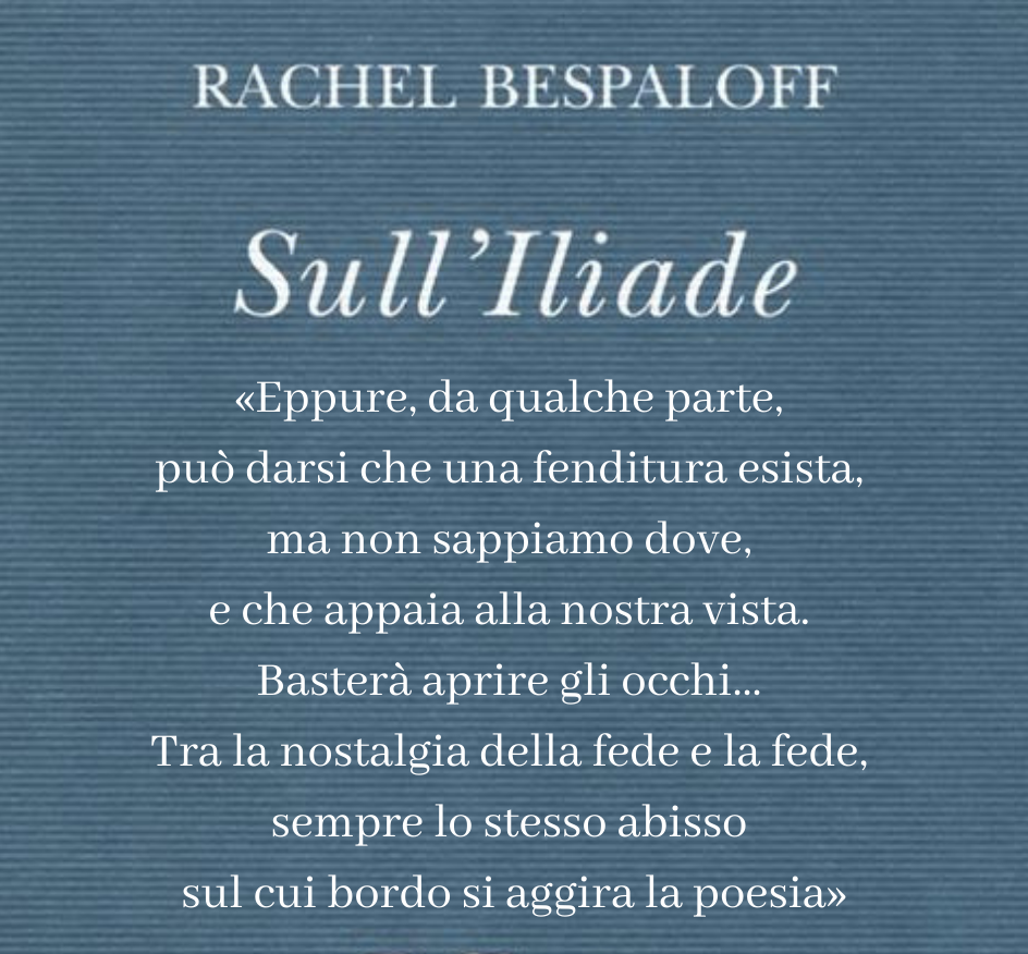Il pensiero di Rachel Bespaloff non è sistematico e si diffrange in scritture diverse, dedicate ad altri pensatori. Il primo libro pubblicato in vita è Cammini e crocevia (1938), che raccoglie saggi diversi su scrittori come André Malraux e Julien Green o filosofi come Nietzsche, Kierkegaard, Marcel e Šestov. Il secondo libro è il saggio che la rese celebre Sull’Iliade, un piccolo capolavoro di scrittura poetica in cui Bespaloff offre una magnifica lettura del poema omerico, interpretato…